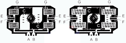 壓縮空氣從(cong)氣口(B)進入氣缸兩(liang)活塞(C)之間中腔時(shi),使⛱️兩活塞分離向(xiàng)氣缸兩端方向移(yí)動,迫使兩端的彈(dàn)👌簧壓縮,兩端氣腔(qiang)的空氣通過氣口(kǒu)(A)排出,同時使兩活(huó)塞(C)的齒條同步帶(dai)動輸出軸(D)(齒輪)逆(nì)時針方向旋轉90度(du)。在壓🔱縮空經過電(dian)磁閥換向後,氣缸(gāng)的兩活塞在彈簧(huáng)的彈力下向中間(jian)方向移動,中間氣(qi)腔的空🔞氣從氣口(kou)(B)排出,同時使兩活(huó)塞(C)的齒條同步帶(dai)動輸出軸(D)(齒輪)順(shun)時針方向旋轉90度(dù)。可以從兩端調整(zheng)微量角度,松動螺(luó)母(E)用内六角扳手(shǒu)擰動🌈調節螺栓(F)調(diao)整所需角度,鎖緊(jǐn)螺母❄️(E)。