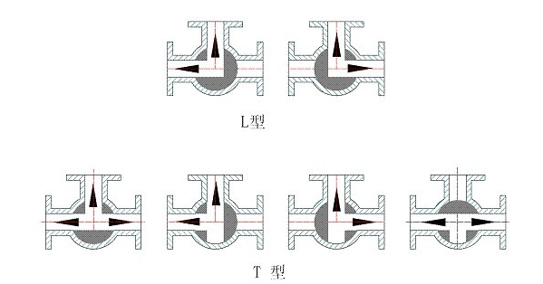 氣動三(san)通球閥分L型和T型,介(jiè)質流通方向見(jian)下圖。氣動三通(tōng)L型球閥适(shì)用于介質流向(xiang)的切換,能使相(xiàng)互垂直的兩個(ge)通🏒道連通:氣動(dong)三通T型球(qiú)閥适用于介質(zhì)的分流、合流或(huo)流向切換,T型孔道可以使(shi)三個通道互相(xiàng)連通或使其中(zhōng)兩個通道連♈通(tōng),氣動三通球閥(fá)一般采用三個(gè)閥座結構,亦可(kě)✂️根據🔴用戶🥰要求(qiu)采用🥵四閥座結(jié)構。